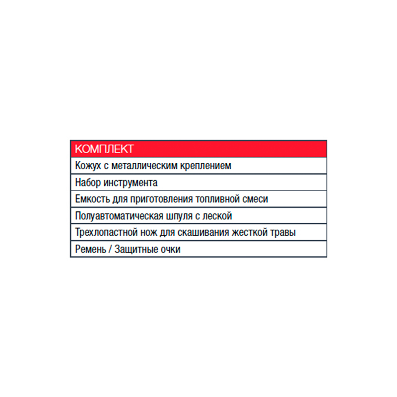 Кожух с металлическим креплением, Набор инструмента, Емкость для приготовления топливной смеси, Полуавтоматическая шпуля с леской, Трехлопастной нож для скашивания жесткой травы, Ремень / Защитные очки |